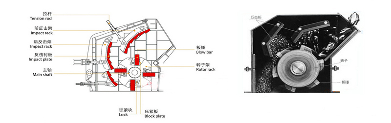 反擊式破碎機是一種利用沖擊能來破碎物料的破碎機械。機器工作時,在電動機的帶動下,轉子高速旋轉,物料進入板錘作用區時,與轉子上的板錘撞擊破碎,后又被拋向反擊裝置上再次破碎,然后又從反擊襯板上彈回到板錘作用區重新破碎,此過程重復進行,物料由大到小進入一、二、三反擊腔重復進行破碎,直到物料被破碎至所需粒度,由出料口排出。調整反擊架與轉子之間的間隙可達到改變物料出料粒度和物料形狀的目的。